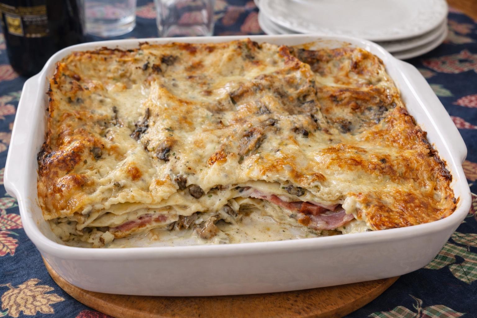 Questa lasagna è uno di quelli: bianca, morbida, cremosa, costruita strato dopo strato mentre la cucina si riempie di profumi familiari. I funghi trifolati danno carattere, i formaggi sciolgono tutto in un abbraccio e il prosciutto rende ogni boccone completo.
