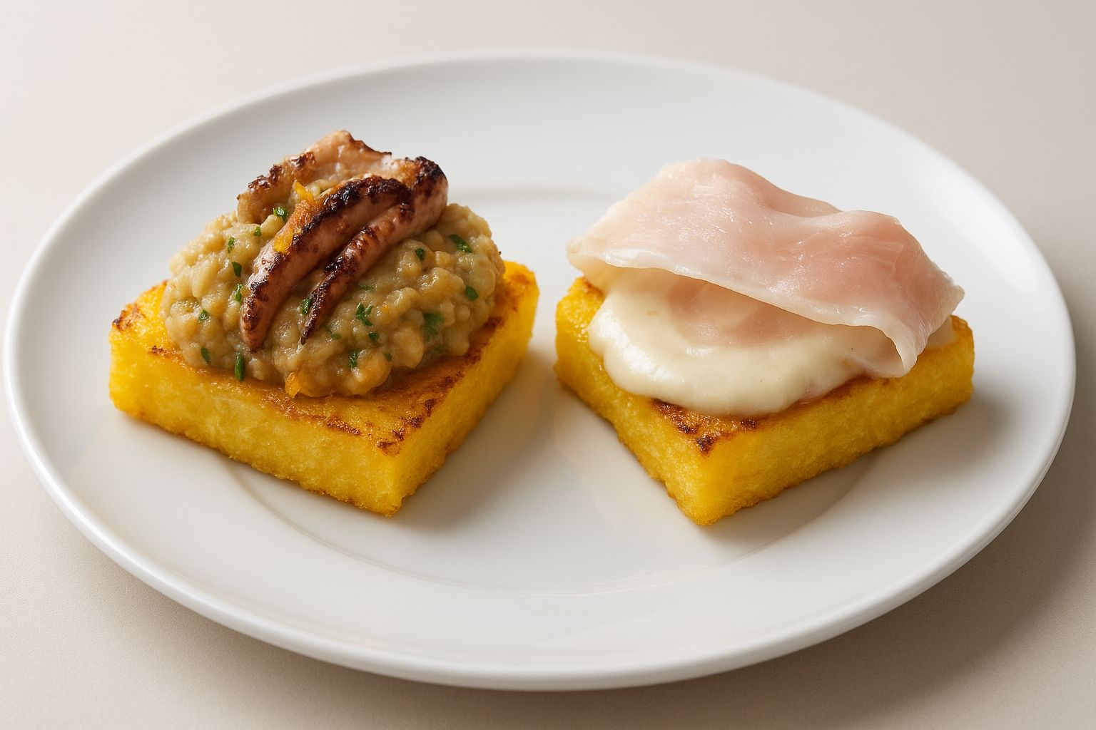 Un’idea semplice, nata lì per lì: una fonduta cremosa che incontrasse la polenta croccante. Poi, una folgorazione: una fetta sottilissima di lardo sopra, appena appoggiata, pronta a sciogliersi con il calore. Ed è nato un crostone che sa di coccola, di casa e di inverno.